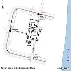- 🌍 Albertfalva Roman military camp (Albertfalvai római katonai tábor és település), Hunyadi János utca (Near to Savoya Park Shopping Centre). 24/7. Archeological site. First camps made at reign of emperor Claudius around 30 BC. It was one of the earliest Pannonian limes (border) forts. Rebuilt under Emperor Trajan at the end of his reign. The place is in bad condition, and sometimes under water. Free.