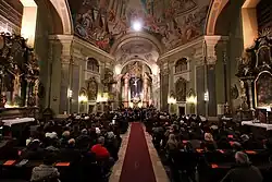 - 🌍 Monastery and Church of the Nuns of Elizabeth (Erzsébet-apácák kolostora és temploma), I, Fő utca 41-43 (Batthyány tér M2 ), ☏ +36 1 213-7508, gemeinde@elisabeth.hu. In the Turkish period stood on the site of this church, a mosque with a dervish monastery. After the liberation of Buda (1686), for the Bosnian Franciscans were building this, in thanks to their pastoral work during the Turkish occupation. The monastery was gradually expanded with seminar, theological college and extended with a rich library. The present Baroque church began Jakab Hans in 1731 to build, and the tower was not built until 1739–1741. The facade sculptures date from the Franciscans times. In the central niche is the Immaculata statue, right and left the statues of St. Francis and of St. Anthony can be seen. At the gate, the Franciscan coat of arms can be seen. Interior: At the entrance, on the right column of the holy water basin indicates a blackboard to the level of the flood of 1838. The ground plan of the nave Baroque church is rectangular. The frescoes of the apse have been painted by Károly Ferenc Innocent and Beder in 1890. The high altarpiece, the stigmata of St. Francis is, right and left are the statues of Peter and Paul; angels hold the attributes of the martyrdom of the two apostles. In the church there are eight side altars.