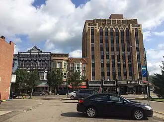 - 🌍 Goff Building, 321 W. Main St. (2 miles [3.4 km] off the Buffalo-Pittsburgh Highway via West Main and West Pike Streets). Standing nine stories in height and boasting an extraordinarily exquisite French Renaissance Revival design, the Goff Building is the last (and, many say, the grandest) of the five downtown Clarksburg buildings commissioned by Nathan Goff: it was erected in 1911, at which time its namesake was serving as a judge on the U.S. Circuit Court. Architect Frank Pierce Milburn patterned the design of this H-shaped early skyscraper after a pair of Classical columns, with a "base" comprising a row of storefront windows separated by engaged Tuscan pilasters, vertical rows of windows framed by Gibbs surrounds making up the "shafts", and an ornate mansard-style roof as the "capital". The Goff Building originally housed shops and a bank on its ground floor and offices above; it's now vacant and has spent the past few years passing through the hands of a number of owners with diverse plans for redevelopment.