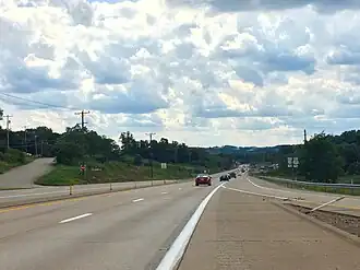 As you continue southward on 119, you'll quickly find yourself entering the suburban outskirts of the next city along the highway. About five and a quarter miles (8.3 km) past the state line, you'll come to the oddly configured intersection with Cheat Road, with signs directing you variously toward Interstate 68, State Route 857, and the southward continuation of 119. Make a sharp right, following the signs for the latter.