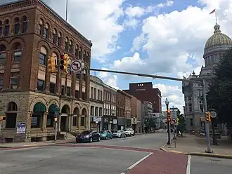 After about a mile (1.8 km), North State Street veers to the left and becomes West State Street. Then, after its intersection with Erie Street, it changes names again — to East State Street. Continue straight.