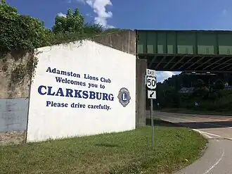 To get to downtown Clarksburg, where most of the attractions described in this article are found, continue along the southbound 19 for another mile and a half (2.3 km), then stay straight on West Pike Street after crossing the bridge over the West Fork River. About a quarter mile (300 m) later comes a fork in the road at which all traffic in your direction must bear right. That's West Main Street. Continue eastward for a couple of blocks.