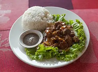 - Lok lak (ឡុកឡាក់) – one of the most common meals in the country is this beef dish. Small pieces of beef are stirfried in a special sauce and arranged over lettuce leaves on a bed of onions and served with steamed rice (or French fries in the tourist version lok lak barang) or a fried egg. The dish comes with a small bowl of lemon juice mixed with black peppers.
