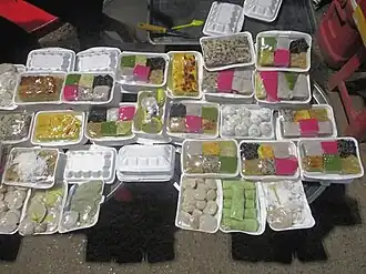 - Prawn cakes (កំពិសចៀន, kompis chean) — another popular street food snack made from a mixture of rice flour and prawns fried in oil in a pan and eaten freshly fried by dipping in a mixture of lime juice, ground black pepper and salt.