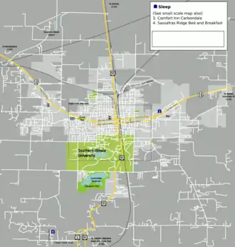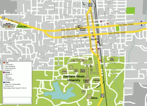 Most Carbondale hotels are on Main Street (Illinois Highway 13) at either the extreme east or west edges of town. This doesn't make for the easiest stumble home from say, South Illinois Avenue, but there's always the cab company, or Lyft or Uber.