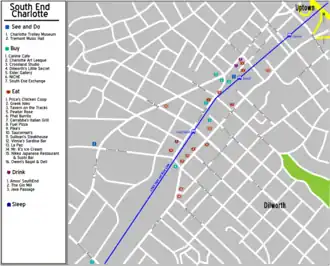 South End is well connected to other parts of Charlotte. South Blvd connects to I-485 south of the city, giving visitors from that direction an easy inlet to the district. Visitors from the Uptown area may travel down South Blvd by car (the easiest way is to take S. Brevard until it becomes South Blvd after the I-277 junction). A cab is also a reasonable option, since the district is only about a mile from Uptown.