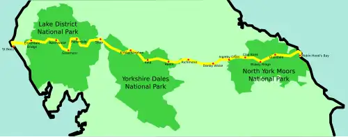 Along its route the walk passes through three National Parks: The Lake District, the Yorkshire Dales, and the North York Moors. The creator suggested walking from West to East in order to enjoy the best possible views, and to have any prevailing weather at your back rather than in your face.