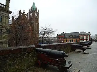 - Guildhall, Guildhall St BT48 7BB (opposite Tower Museum), β +44 28 7137-6510. Daily 11AMβ4PM. Built in 1890, this fine building is where the city council meet. It's just outside the city walls, and for decades its councillors saw their role as shutting the Catholics out of housing and jobs as effectively as the walls shut out King James. It therefore became a target for nationalists and was twice bombed. It contains a museum exhibit on the history of Derry, a small exhibit on the Saville Inquiry and houses the Nobel, Gandhi and Martin Luther King Jr peace prizes of John Hume. In summer there are guided tours but these are suspended in 2021, but an outdoor 15-minute tour is available on request for Β£2 as of February 2023. Free.