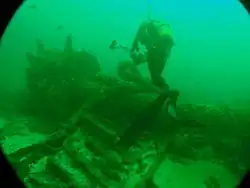 Scattered wreckage of a historical wreck of great cultural significance. The wreckage includes remains of the paddle wheels, boiler and engine, which is a very early model and quite interesting in design. There are also a few anchors, cannon and similar generic type artifacts.