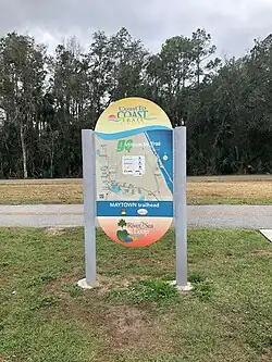 • 🌍 Maytown Trailhead, Maytown Spur Rd, Maytown (turn south on Maytown Spur Rd from Osteen-Maytown Rd). Direct access to the trail, along with parking and a restroom, in Maytown. This trailhead is close to the division between the Edgewater and Titusville forks. There is a pit stop south of the trailhead where you can buy water and snacks. Maytown Rd is not directly accessible from I-95; to access this trailhead from I-95, exit at Deering Pkwy or FL-442 and follow US-1 to the Maytown Rd exit. OSM directions target=_blank