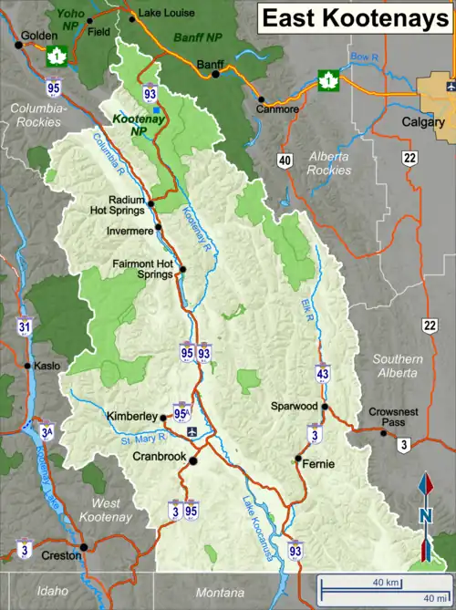 The East Kootenays is a region in south-eastern British Columbia, Canada, generally taken to include the valley of the Columbia and Kootenay Rivers south of Golden to the U.S. border. The valley sits between the Rocky Mountains to the east and the Purcell Mountains to the west. About 60,000 people live in the region (2016).