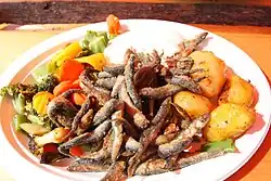 - Vendace (muikku), a delicacy from the lakeland Finland. A small salmonid fish served rolled in a mix of breadcrumb flour and salt, and fried in butter till crunchy. They are traditionally served with mashed potatoes, and you will find them sold at most music festivals and open air market events. The local variety of vendace living in the lakes of the Koillismaa highlands – the Kitkan viisas – enjoys the protected designation of origin (PDO) status in the European Union.