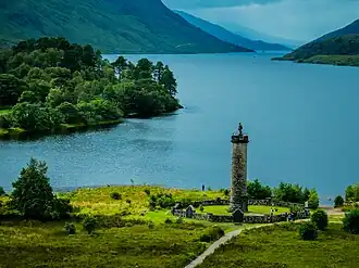 Glenfinnan is a village in the Western Highlands of Scotland, between Fort William and Mallaig. Standing at the head of Loch Shiel, it's famous as the place where "Bonnie Prince Charlie" launched his 1745 Jacobite rebellion. The railway to Mallaig here sweeps over the valley on the spectacular Glenfinnan Viaduct, used as a location in several films and TV series. The viaduct also features on the Bank of Scotland (2007 & 2017 series) £10 note. In 2011 the village population was 139.