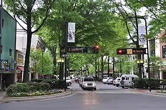 Greenville is on the Interstate 85 corridor, linking it to Atlanta and Charlotte, and Interstate 26, which is in nearby Spartanburg, goes northwest through Asheville on to Tennessee, and southeast on to Charleston. It is also at the northern terminus of the Interstate 385 corridor. The other freeways that converge in the area include Interstate 185 and U.S. Highway 123 (Calhoun Memorial Highway). Other major highways include U.S. Highway 25, Business U.S. Highway 25, U.S. Highway 29 and U.S. Highway 276. Main Street is home to many of the downtown area's shopping and dining destinations.