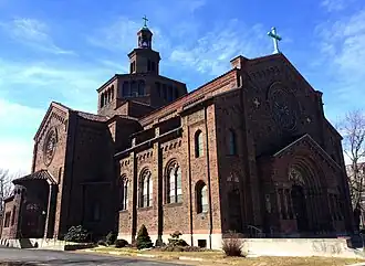 - St. Luke's is one of the last of the grand old churches built in Buffalo—erected in 1930 from a design by the prolific local firm of Oakley & Schallmo, it's a stout Romanesque Revival building with a basilica floor plan and a notable Classical flavor to its architecture. The ultimate inspiration for its design, like that of St. Gerard's which you'll see later in the tour, was the Basilica of St. Paul Outside the Walls in Rome, though St. Luke's differs from its model with a façade of ruddy brick and terra cotta taking place of the original's marble, as well as in the entrance portico facing Sycamore Street, which rather than a wide entablature supported by Corinthian columns is an arcade of compound round arches decorated in a guilloche pattern. But look above and between those arches and you'll see the most impressive decorative features of the church—splayed above the entrance is an exquisite multicolored terra cotta frieze that depicts Biblical scenes, and in the spandrels between the arches you'll see four round terra cotta relief sculptures that depict the four authors of the Gospels. Finally, bookending each side of the church are the former school building and a handsome campanile that's connected to the building yet freestanding.