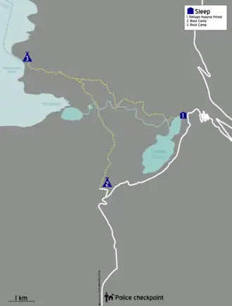 - 🌍 Refugio Huayna Potosi (at the end of Lake Zongo), ☏ +591 2 74 00 45. offers accommodation, meals. The Altamirano family, +591 71 55 77 37, who runs "base camp" is building a competing refugio, completion and pricing of which is unclear. Cost of lodging is Bs. 80 per person..
