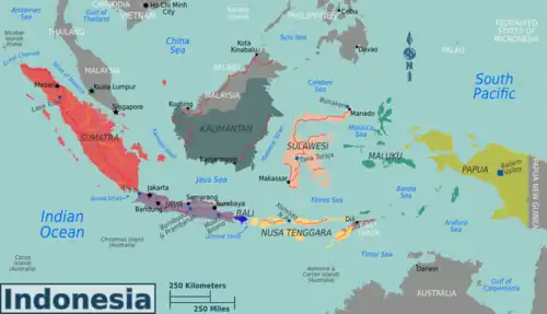 Most of the 38 provinces are composed of a group of smaller islands (East & West Nusa Tenggara, Maluku), or divide up a larger island and its outlying islands into pieces (Sumatra, Kalimantan, Java, Sulawesi, Papua). The listing below follows a simpler practice of putting together several provinces in one region, except with Bali, which is treated as a separate region in Wikivoyage.