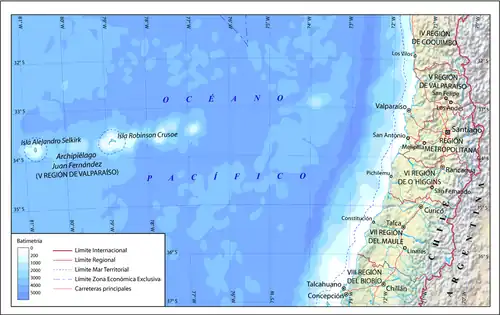Juan Fernández Islands is a small archipelago 670 km off the coast of Central Chile. They are remote islands, home to about 900 people who survive on lobster fishing and several hundred tourists who make the obscure islands a vacation destination each year. The rugged, mountainous islands are quite attractive, but you won't find white sand beaches, and the water is much colder than the weather might indicate, owing to the northerly Humboldt Current.