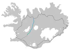 North of Hveravellir, the landscape gradually changes to heathland and tundra. You pass the "longest fence in Iceland", erected to prevent the spread of sheep diseases. Once you have crossed the Dúfnefsfell, you come to the Árnarbæli hut, from there you have a beautiful view of Langjökull, Hofsjökull and to Kerlingarfjöll. You'll leave the high valley of Kjölur, as it slowly becomes greener and numerous sheep can be seen on the humpback meadows. You'll then pass the small Cafe Áfangi, where horse riding trips are occasionally offered. At the southern end of the Blöndulón lake district is Áfangafell with a small parking lot and a beautiful view. Due to the reservoir, the slope was rerouted here and the streams and rivers were bridged. The Blöndulón, which has been dammed since the late 1980s, is now the fourth largest lake in the country at over 56 km2 (22 sq mi). The Blandá power plant generates 150 MW of power at a waterfall height of 288 m. The Kjölur slope ends around the power station.
