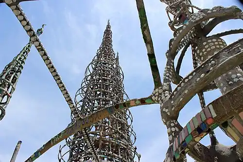 - π Watts Towers of Simon Rodia, 1765 E 107th St (east of Graham Ave and the Metro Rail tracks; near and visible from the 103rd Street/Watts Towers station on the Metro Rail Blue Line), β +1-213-847-4646. Tours available Th-F 11AM-3PM, Sa 10:30AM-3PM, Su noon-3PM. A notable example of non-traditional vernacular architecture and naΓ―ve art, the Watts Towers are a series of 17 interconnected structures, two of which reach heights of over 99 feet (30 m). All of the structures were built using salvaged materials and embedded with found objects, such as glass, ceramic tiles, and seashells, often arranged in elaborate displays. Next to the towers is a small museum and a cultural center. Guided tours are available for a fee and at limited hours, but you can always view the towers from the outside for free. Guided tours $7 adults, $3 seniors/teens (13-17), free for children 12 and under.