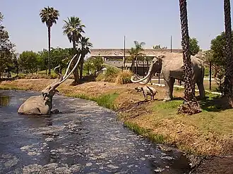 - π Page Museum at the La Brea Tar Pits, 5801 Wilshire Blvd, β +1-323-934-7243. Daily 9:30AM-5PM. An excellent museum that displays fossils of animals β including saber-toothed cats, dire wolves and mammoths β that got stuck in tar pits during the Ice Age 10,000 to 40,000 years ago. Visitors can watch fossils being prepared and learn about the natural and human history of the tar pits. However, the real highlight is just outside the museum in Hancock Park, where you'll find a Pleistocene Garden and the tar pits themselves, with life-size replicas of extinct mammals and where you can witness the ongoing excavation of the pits. Adults $12, youth (13-17)/seniors (62+)/college students (w/ ID) $9, children (3-12) $5, children under 3 free. Free general admission for everyone 1st Tu of the month, except July and August.