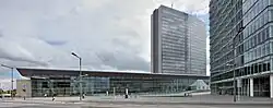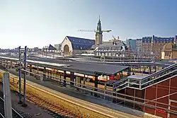 It is relatively well served by connections from neighbouring countries. The railway station can be reached by the tram and most local buses. The city centre is within walking distance (around 1.5 km). The train station has a restaurant and a large newsagents, as well as a left luggage office (flat fee of €5 per bag) on platform 1. The train station is immediately adjacent to the long distance bus station as well.