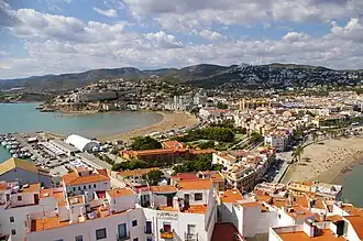 Peñíscola (Valencian: Peníscola) is a town of 7,500 people (2018) in the province of Castellón on the Mediterranean coast of Spain. The town with its 5 km of beaches is one of the most heavily visited tourist destinations in Spain, popular with Spanish and foreign visitors; in summers the population of this small town explodes to more than 150,000 people.