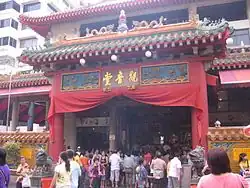 - 🌍 Yueh Hai Ching Temple (粵海清廟/粤海清庙), 30B Phillip St (Riverside). Singapore's oldest Teochew temple, also known as Wak Hai Cheng Bio in Teochew, built in a traditional Teochew architectural style, with the hall on the left dedicated to the goddess Mazu, and the hall on the right dedicated to the god Xuan Tian Shang Di. The hall on the right is also home to an idol of the traditional Chinese love god Yue Lao (identifiable by the red strings around his neck), and commonly prayed to by single locals looking for love. The temple is known for its intricate carvings, and what distinguishes it from regular Teochew temples that you can see in China is the colourful roof sculptures depicting scenes from Teochew opera. The temple possesses a plaque inscribed with the Chinese characters 曙海祥雲 (Peaceful clouds over the Ocean at Dawn), which was presented to it by Emperor Guangxu of China in 1899, making it one of only two temples in Singapore bestowed with this honour.
