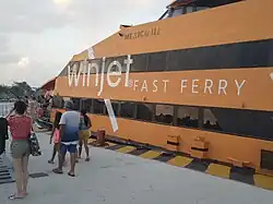 From Cozumel there are two competing companies which ship you across: Winjet and Ultramar. The price is M$260 (Dec 2023), or about US$13/26 one-way/return (Feb 2022). Both companies operate from the main ferry dock 🌍 Ferry Terminal on the south end of the city, just south of the plaza. Boats leave every hour, from 08:00-20:00, and the ride is 30 minutes. A second dock (Muelle Constituyentes) is sometimes used by Ultramar.