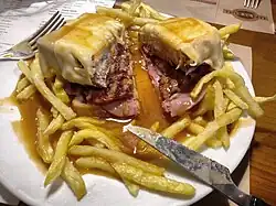 - The Francesinha hails from Porto. It is a sandwich containing ham, linguiça sausage, steak, or roast meat, covered with melted cheese and spiced tomato and beer sauce. Exact ingredients vary by chef. It usually comes with fries (chips). The sandwich was inspired by France's croque-monsieur, and the name translates as "litte French girl".