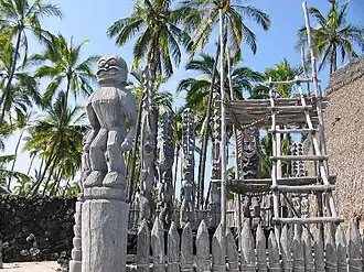 • The Puuhonua (Place of Refuge). This area was sanctuary from death sentences. A great wall marks the boundaries between the royal grounds and the sanctuary. Many ki'i (carved wooden images) surround the Hale o Keawe, housing the bones of the chiefs that infuse the area with their power or mana. If you reached this sacred place, you were saved.