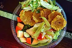 - tostones — twice deep-fried plantain chips, best when freshly made.