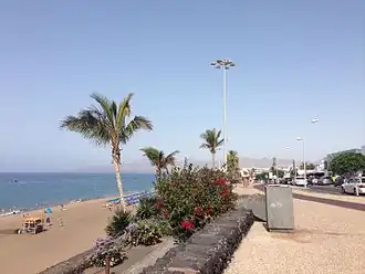 Puerto del Carmen is a large tourist resort on the south coast of Lanzarote, a few km west of Arrecife the capital and airport. It has long sandy beaches (unusual on this island) which are more sheltered than the exposed north and west-facing coasts. It's part of the municipality of Tías but has far outgrown that small town, and in 2022 it had a population of 11,319.