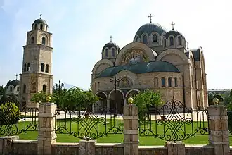 - 🌍 Church of the Holy Trinity (Црква „Св. Троица“). Radoviš's best-known attraction. This church is one of the most impressive built in the Balkans this century. Completed in 2003 with funds donated by Macedonian millionaire Risto Gušterov, a native of the city. Its frescoes were painted by Ukrainian artists, while its iconostasis was done by artists from Gevgelija. Along with the chairs, the iconostasis is made of 24-carat gold. The inside also shows inspiration from ancient Macedonia, particularly with the floor mosaic of the Vergina Sun. Architecturally, the church contains elements from styles from various Orthodox countries. There is a detached bell tower beside the church which rises 23.5 m (77 ft) tall.