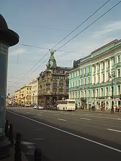 Nevsky Prospekt (Невский проспект)). Offers magnificent view to Kazansky cathedral from terrace. Pastries are well worth the price. Averages: soups 330-380 руб; salads 400-700 руб; pizza 500 руб; mains 1000 руб; tiramisù 320 руб.