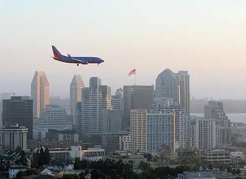 Boeing 737 flying past Downtown on final approach to SAN