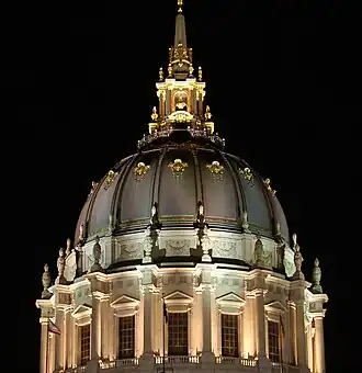- 🌍 City Hall, 1 Dr. Carlton B. Goodlett Pl (between Van Ness Ave, McAllister St, Dr. Carlton B. Goodlett Place, and Grove St), ☏ +1 415-554-4933, fax: +1 415-554-4936, City.Hall.Building.Management@sfgov.org. Brochures are available for visitors to take a self-guided tour: M-F 8AM-8PM. Docent led tours: M–F 10AM, noon, 2PM. Designed by Arthur Brown Jr., and opened in 1915, the architecture of the building was heavily influenced by the "City Beautiful Movement," which in turn reflected the American Renaissance style of the time. Its "Beaux-Arts" dome (the fifth largest in the world) was modeled after that of St. Peter's Basilica in Rome, Italy. The building itself is huge, 393 feet long, by 273 feet wide, and 307 feet high — occupying a full two blocks of San Francisco's downtown real estate. It is considered by many admirers to be the most impressive building in the city. Inside, it features a large rotunda with a grandiose staircase leading up to the second floor. The walls are adorned with oak paneling and the ceilings with crystal chandeliers. City Hall is the site of much history — In 1954 Joe DiMaggio and Marilyn Monroe wed here. In 1978, Mayor George Moscone and Supervisor Harvey Milk were assassinated here. Tours: Self guided and docent led tours are free unless you're a private group of eight or more persons.