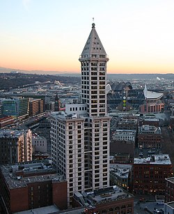 - π Smith Tower, 506 2nd Ave, β +1 206 622-4004, info@smithtower.com. Self-guided tour daily 10AM-9PM; observatory & bar Su-W 10AM-11PM, Th-Sa 10AM-midnight. Built in 1914, the Smith Tower was Seattle's first skyscraper, and the tallest building on the West Coast for nearly half a century before being overtaken by the Space Needle. Uniformed attendants operate the old copper and brass elevators from which you can peer into the different floors and offices as you ascend, an experience most people today have probably only witnessed in old movies. The outdoor Observatory on the 35th floor wraps completely around the four sides of the tower, providing panoramic views of the Olympic and Cascade mountain ranges, including Mt. Rainier, as well as of Elliott Bay, Downtown Seattle, and Pioneer Square. The interior of the 35th floor contains a speakeasy-themed bar, formerly known as the Chinese Room for its ornately carved ceiling and a number of decorative flourishes imported from China in the early 20th century. There is a 40 minute self-guided tour (separate admission fee) about Seattle's history from the 1920s and beyond that is available. Tour and observatory: adults $19; seniors, children, military $15; 10% discount online. Locals $12 in-person only. After 9PM, observatory only $12.