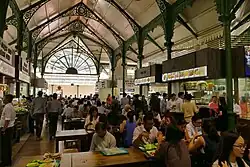- π Lau Pa Sat, 18 Raffles Quay (near Raffles Place MRT). Open 24 hours. A nicely done up Victorian-style hawker centre, but a little pricier and hence quieter than most. Quiet during the day, every evening at 7 PM a section of Boon Tat St on the south side is closed to traffic and a long row of very popular satay stalls opens, with seating right on the pavement. Fatman Satay (Stall #1) generally gets the best reviews, but there are plenty of other good eats to be found.