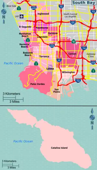 The South Bay region of Los Angeles County in Southern California has many of the fine beaches of its neighboring areas on the West Side, with a wide variety of atmospheres, from high-end and yuppified to still-expensive beach raffish. This is also where you will find the Harbor Area of Los Angeles, an industrial section which along with adjacent Long Beach makes up the busiest shipping port along the Pacific Coast. South Bay is also the launching point for many ferries to Catalina Island.