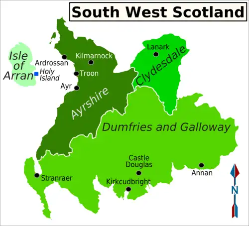 South West Scotland is a lowland region of Scotland, a triangle bounded to the west by the Firth of Clyde and to the south by the Solway Firth. It's mostly rural, but with a strip of resort towns along the Clyde coast and industry inland.