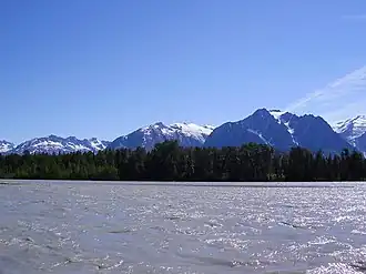Below the mouth of the O’Connor River, the Tatshenshini is dramatically different. The river pours through a braided channel that is over a kilometre wide; expansive views of the glacier-covered St. Elias Ranges dominate the west. Here the coastal influence begins to be felt, while high winds and heavy snowpacks are common. Scientists studying the area say the mixed spruce-willow-birch forest found along this stretch of the river is unique in BC.