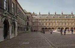 - 🌍 Binnenhof (northwest of the Plein, trams 1 and 9 (Spui stadhuis stop), trams 2, 3, 4 & 6 (Spui/Centrum stop)), ☏ +31 70 7570200, info@binnenhofbezoek.nl. No visits possible, the Binnenhof is closed for restauration. The Binnenhof (Inner Court) is a castle built in the 13th century as residence of the count of Holland. Ever since, it has almost subsequently been the seat of the government of Holland, and later all of the Netherlands. It used to be surrounded by moats on all sides. Since then it has been modified countless times to accommodate the expanding Dutch government. The moats have been filled, but the castle still borders on a pond (the Hofvijver, Court Pond). In its waters the old buildings continue to mirror themselves. Today, the Binnenhof houses the two chambers of the Dutch parliament and the Prime Minister's office in a small octagonal tower opposite the Mauritshuis. Enter through one of the gates on Plein or Buitenhof and you will find yourself in a medieval enclosed courtyard, surrounded by architecture from the 13th up to the 19th century. There may be crowds gathered here on occasion because of public demonstrations, TV airings or receptions for foreign officials. In the centre stands the Ridderzaal (Knight's Hall), the centrepiece of the castle, today used for ceremonial purposes. Unfortunately, the other splendid rooms of the complex are closed to the general public. It is possible, however, to attend the meetings of the parliament. The House of Representatives of the parliament meets every Tuesday, Wednesday and Thursday, in a modern chamber from 1992. The Senate meets on a weekly basis, on Tuesdays, and does so in a splendid 17th century Dutch-styled chamber with a lavishly painted ceiling. Because the Binnenhof is closed for several years (reopening is expected in 2028) there is a temporary view tower at the Buitenhof square, from where you can view some of the progress of the restauration.