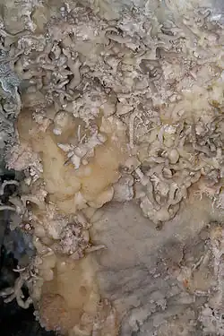 The cave also contains formations displaying colors of green and yellow. X-ray analysis shows this rare green and yellow coloring to be from nickel being incorporated into the crystal structure. The x-ray analysis of the yellow flowstone reveals only calcite, and the green flowstone is from mainly aragonite.