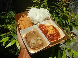 - katsu (カツ) — short for katsuretsu (カツレツ, "cutlet"), this the Japanese version of cutlet, escalope, or schnitzel: a thin slice of meat breaded and deep fried. Tonkatsu (豚カツ), the version that uses pork loin, is the most common, though other meats such as chicken (チキンカツ chikin katsu) or beef (牛カツ gyūkatsu) can sometimes be used. As a main dish, it's usually served with a thick vegetarian brown sauce and shredded cabbage. It can be served over a bowl of rice and covered in an egg and sauce mixture to make katsudon (カツ丼), one of several popular varieties of donburi (rice bowl). It's also commonly served together with Japanese curry rice, in which case in the dish is known as katsu karē (カツカレー).