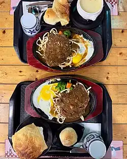 - Steak — As expected, it is a piece of meat that has been seared. However, a local preference is for it to be served on a hotplate, and seasoned with Asian ingredients such as sesame oil, and served with ketchup.