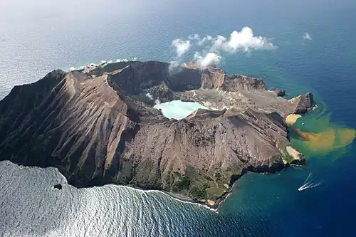 Whakaari/White Island is the only active marine volcano near New Zealand's main islands. It is 48 kilometres off the east coast of the North Island, in the Bay of Plenty. The nearest mainland towns are Whakatane and Tauranga. The island is roughly circular and about 2 km in diameter. The volcano is around 100,000 to 200,000 years old and about two thirds of it is hidden below sea level. There are three distinct craters, only one of which is active, and it has a small crater lake.