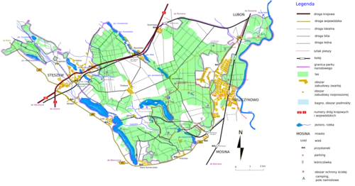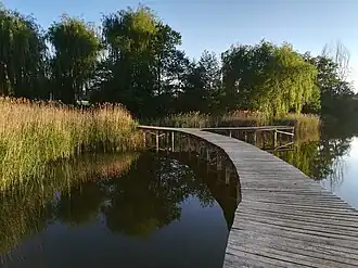 - 🌍 Trzcielin Bog (by Kręta street from Wielkawieś (to the south), from road 306). A very overgrown lake, that slowly becomes a bog. Paradise for birds who flock here in great numbers. There is an observation deck from southern side with good view of entire bog. Some insect repellent and binoculars may be useful. No dogs allowed. While possible to access by car it may not be good idea, as road is in bad shape.