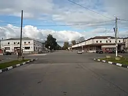 Yuryev-Polsky has a pretty simple rectangular layout. The river flows from north to south and slightly disturbs the regular arrangement of streets and houses. The road from Vladimir comes from the east, the road to Alexandrov and Moscow goes to the south-west, and the road to Pereslavl Zalessky leaves the town in the northern direction. The railroad passes along the southern boundary of the town. The historical center is quite compact and is on the left (eastern) bank of the river. The main square is named Советская площадь (Soviet square). The Trading rows and the monastery of Archangel Michael are found right on this square. The cathedral of St. George is hundred meters away, behind the monastery. The monastery and the cathedral lie within the well-preserved, picturesque ancient ramparts.
